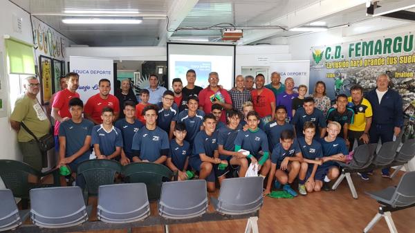 Ayer toco llevar el proyecto Educa Deporte al municipio de Mogán, más concretamente a Arguineguin. En los locales del CD Femarguín, con la presencia de D. Luis Miguel Becerra, Concejal de deportes, D. Luis Miguel Becerra, presidente del equipo anfitrión y con la disertación de la charla por parte de Daniel Carnevali, acompañado por nuestro Presidente, Roque Díaz, junto a los exjugadores Yoyo Vega y Jonay "Futre", moderado por Pedro Luis Cárdenes, se desarrolló dicha charla ante madres, padres, jugadores, monitores-entrenadores, etc., del municipio sureño.