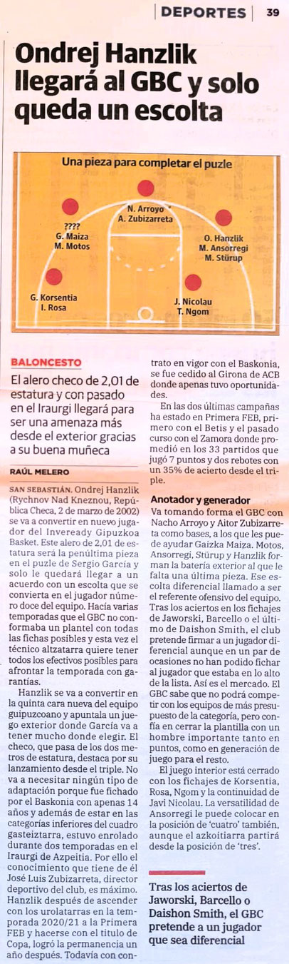 Gipuzkoa Basketek eta Ondrej Hanzlikek akordioa lortu dute jokalari txekiarra fitxatzeko 2025/26 denboraldiari begira.